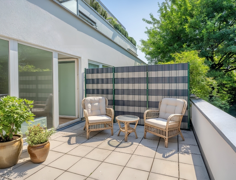 - West-facing sunshine and everything close to hand: this 2-room apartment combines the benefits of city living with the rare luxury of private outdoor space. The spacious living area with its sleek Vito kitchen in mint condition forms the heart of the home—open, welcoming, and flowing seamlessly onto the terrace. Step out onto the exceptionally private 33 m² terrace—an absolute highlight. The sun stays with you until evening, and through the expansive glass frontage, it floods the apartment with light, warming the elegant wood-effect flooring. The bedroom also opens directly onto the terrace—perfect for enjoying the morning air.