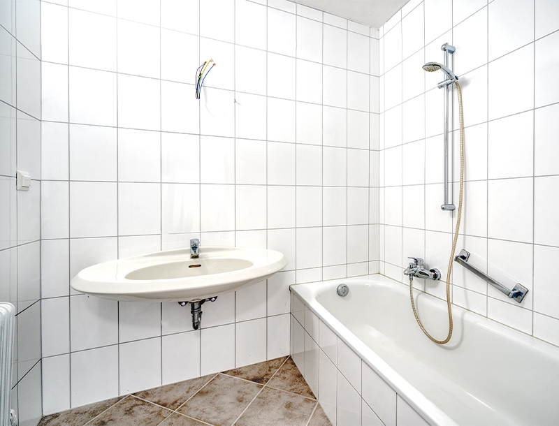 - The pristine white bathroom features a bathtub, with the WC located separately. Constructed in 1972, the apartment boasts oak parquet flooring, a TV system, and an awning. The building also includes communal laundry/drying rooms and bicycle storage facilities.