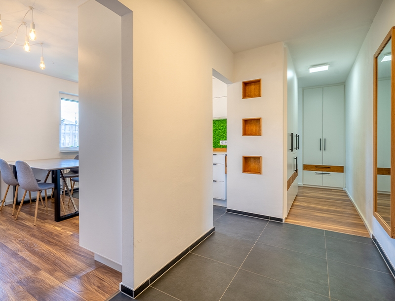 - Herzlich willkommen! Vom Vorraum fällt der Blick in die offene Essküche mit der modernen Tischlerküche samt Keramikplatte, Echtmoos und Touchsystem. Zum Lieblingsplatz wird das helle Wohnzimmer mit Zugang auf den Balkon samt herrlichem Gaisbergblick. Im Schlafzimmer ist der perfekte Einbauschrank mit Kleiderlift schon vorhanden, im Vorraum gibt es eine clevere Lösung für Waschmaschine und Trockner. Das separate WC überzeugt mit einem handgefertigten Holzwaschbecken, im Tageslichtbad erfrischt die große Walk-In-Dusche. Ein weiteres Zimmer eignet sich perfekt als Kinderzimmer oder Homeoffice. Ein Abstellraum mit Funktionsauszügen sowie viele durchdachte Details ergänzen das smarte Raumangebot.
