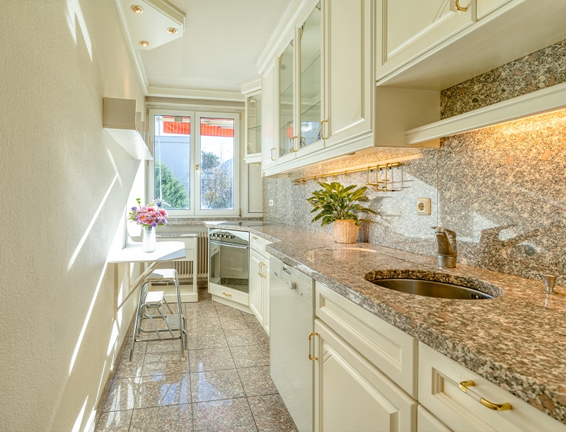 - Aufhübschen und genießen! Herzstück des durchdachten Raumkonzeptes ist das helle und freundliche Wohnzimmer, das sich auf einen frischen Look freut und sich zur herrlich großen Terrasse öffnet – ideal zum Sonne tanken und für gemütliche Abende mit der Familie und Freunden. Anschließend befindet sich die Küche in Weiß mit Fenster sowie Platz für ein Frühstückstischchen. Zwei ruhig gelegene Schlafzimmer, ein Retro-Wannenbad mit WM-Anschluss, das extra WC mit besonders hübschen blauen Fliesen und der praktische Abstellraum ergänzen das perfekte Raumangebot.