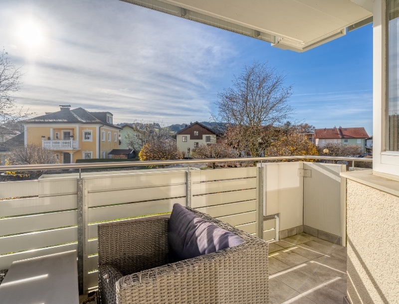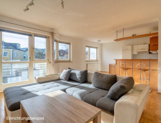 - Hereinspaziert und den perfekten Raumschnitt genießen! Das Zentrum der Wohnung bildet der groß-zügige Wohnbereich mit Zugang auf den Balkon, der durch eine große Fensterfront mit Licht durchflutet wird. Eine Couchzone und ein Essplatz machen den Raum so richtig gemütlich. Die integrierte Küche wird durch einen Barbereich für den schnellen Kaffee erweitert. Im großzügigen Vorraum ist das separate WC und ein Abstellraum mit WM-Anschluss zu finden, zwei gemütliche, individuell nutzbare Schlafzimmer und das Wannenbad in Weiß vervollständigen das Raumangebot.