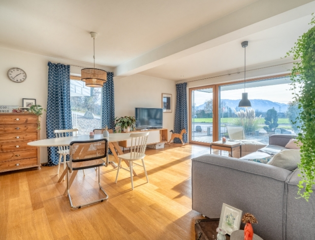 - Neuwertige Wohnung in einem modernen 3-Parteienhaus! Das Wohnzimmer begeistert mit einer großen Glasfront samt Bergblick und Terrasse, die Küche in Weiß stammt aus Tischlerhand, anschließend befindet sich eine praktische Speis. Das Badezimmer erfrischt mit einer großen Walk-In Dusche und Fenster, eine Wanne wäre möglich. Das WC sowie ein Wirtschaftsraum mit WM-Anschluss befinden sich separat. Die beiden Schlafzimmer sorgen für eine ungestörte Nacht. Highlight: Der an die Wohnung angrenzende Hobbyraum könnte ggf. mit der Wohnung verbunden werden. Zusätzlich: Ein Abstellraum im EG.