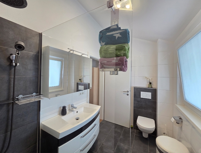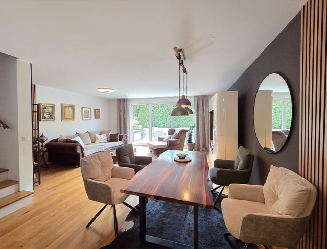 - Im Erdgeschoß begrüßt der offene, stylische und moderne Wohn- und Essbereich, gleich anschließend befindet sich die gepflegte DAN-Küche samt hochwertigen Markengeräten. Auf der Südterrasse lässt es sich herrlich chillen und grillen, ganz ohne lästige Gartenarbeit. Weiters im Erdgeschoß: das Gäste WC. Im Obergeschoß mit einer Raumhöhe bis zu ca. 4,5 m befinden sich drei Schlafzimmer, das Badezimmer mit Walk-In-Dusche, WC und Fenster. Im Untergeschoß steht ein beheizter Hobbyraum zur individuellen Nutzung, ein Lagerraum, ein Abstellbereich, die Haustechnik sowie ein Nassbereich mit Whirlwanne und Waschtisch zur Verfügung.