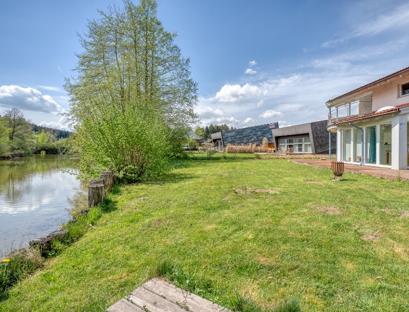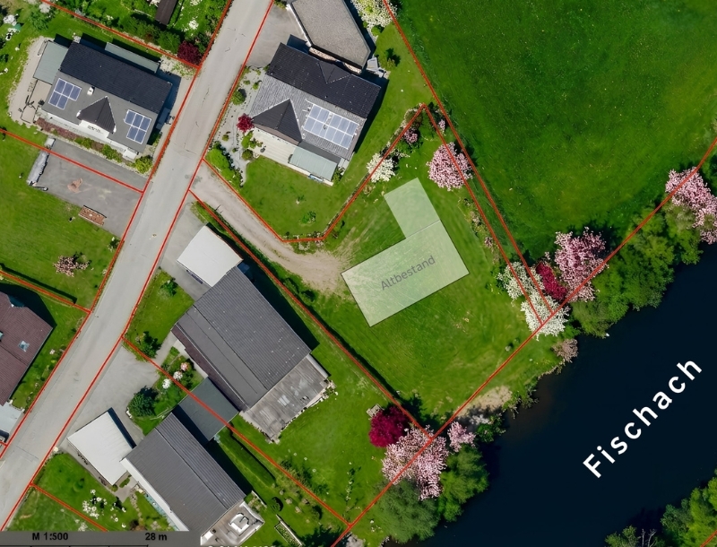 - Großzügiges Sonnengrundstück mit direktem Zugang zur Fischach mit 765 m² Grundfläche samt Altbestand (EFH im Holzriegelbau mit ca. 170 m² Wohnfläche, voll unterkellert, große Doppelgarage).
