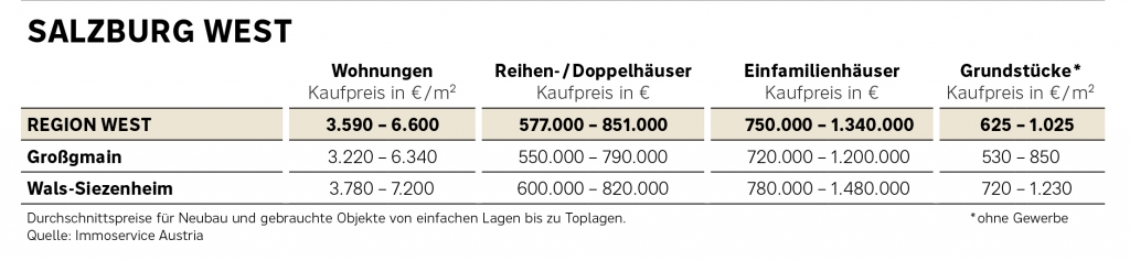 Naturgemäß nimmt diese Entwicklung auch Einfluss auf den Immobilienmarkt. Während vielerorts noch Bauernhöfe und Einfamilienhäuser zu finden sind, sind attraktive Wohnbauprojekte auf dem Vormarsch. Der Trend geht eindeutig in Richtung Mehrfamilienhaus, um den Bedarf an Wohnraum in dieser beliebten Region zu decken und um dem raschen Bevölkerungswachstum Rechnung zu tragen. Auch wenn Wals-Siezenheim und Großgmain derselben Region angehören, so könnten diese Gemeinden kaum unterschiedlicher sein. In Wals-Siezenheim werden Eigentumswohnungen immer populärer und beginnen das Ortsbild zunehmend zu verändern. Auch Mietwohnungen sind in dieser Region verstärkt im Angebot. Firmen siedeln sich an und Gewerbeflächen entstehen. Im Gegensatz dazu mutet Großgmain richtig dörflich an. Hier prägen noch Einfamilienhäuser und zahlreiche Bauernhöfe die Landschaft, der Immobilienmarkt ist wesentlich enger. Preislich liegt die Region mittlerweile an der Spitze des Salzburger Umlands. Die Stadtnähe, der Zuzug, das Wirtschaftswachstum und die Nähe zur Natur zeichnen dafür verantwortlich.